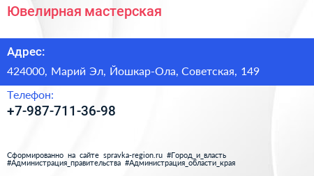 Ювелирная мастерская по адресу 424000, Марий Эл, Йошкар-Ола, Советская, 149 в дальнейшем Организация, размещена в следующих категориях: