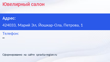 Ювелирный салон по адресу 424033, Марий Эл, Йошкар-Ола, Петрова, 1 в дальнейшем Организация, размещена в следующих категориях: