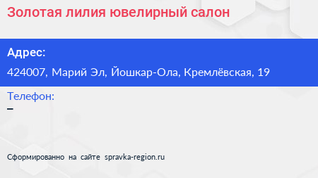 Золотая лилия, ювелирный салон по адресу 424007, Марий Эл, Йошкар-Ола, Кремлёвская, 19 в дальнейшем Организация, размещена в следующих категориях: