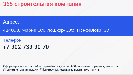 365, строительная компания по адресу 424008, Марий Эл, Йошкар-Ола, Панфилова, 39 в дальнейшем Организация, размещена в следующих категориях: