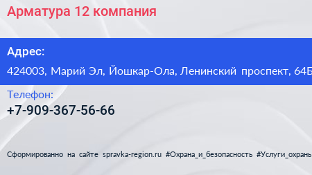 Арматура 12, компания по адресу 424003, Марий Эл, Йошкар-Ола, Ленинский проспект, 64Б в дальнейшем Организация, размещена в следующих категориях: