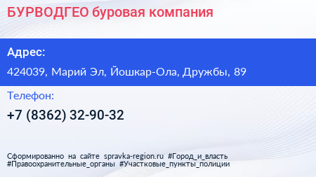 БУРВОДГЕО, буровая компания по адресу 424039, Марий Эл, Йошкар-Ола, Дружбы, 89 в дальнейшем Организация, размещена в следующих категориях: