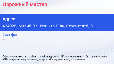 Дорожный мастер по адресу 424028, Марий Эл, Йошкар-Ола, Строителей, 31 в дальнейшем Организация, размещена в следующих категориях: