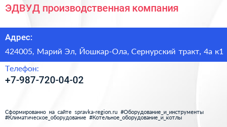 ЭДВУД, производственная компания по адресу 424005, Марий Эл, Йошкар-Ола, Сернурский тракт, 4а к1 в дальнейшем Организация, размещена в следующих категориях: