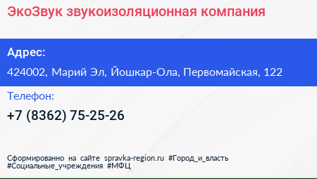 ЭкоЗвук, звукоизоляционная компания по адресу 424002, Марий Эл, Йошкар-Ола, Первомайская, 122 в дальнейшем Организация, размещена в следующих категориях: