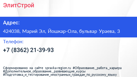ЭлитСтрой по адресу 424038, Марий Эл, Йошкар-Ола, бульвар Ураева, 3 в дальнейшем Организация, размещена в следующих категориях: