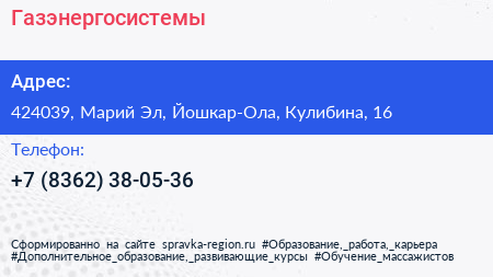 Газэнергосистемы по адресу 424039, Марий Эл, Йошкар-Ола, Кулибина, 16 в дальнейшем Организация, размещена в следующих категориях: