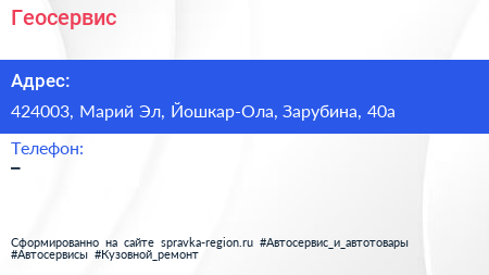 Геосервис по адресу 424003, Марий Эл, Йошкар-Ола, Зарубина, 40а в дальнейшем Организация, размещена в следующих категориях: