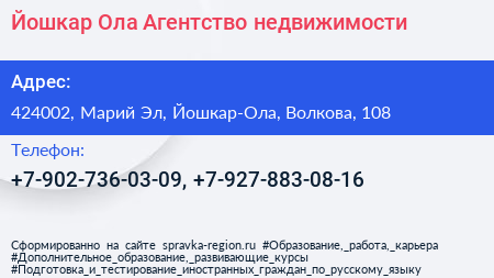 Йошкар-Ола, Агентство недвижимости по адресу 424002, Марий Эл, Йошкар-Ола, Волкова, 108 в дальнейшем Организация, размещена в следующих категориях: