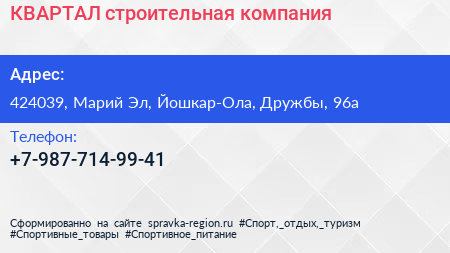 КВАРТАЛ, строительная компания по адресу 424039, Марий Эл, Йошкар-Ола, Дружбы, 96а в дальнейшем Организация, размещена в следующих категориях: