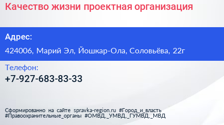 Качество жизни, проектная организация по адресу 424006, Марий Эл, Йошкар-Ола, Соловьёва, 22г в дальнейшем Организация, размещена в следующих категориях:
