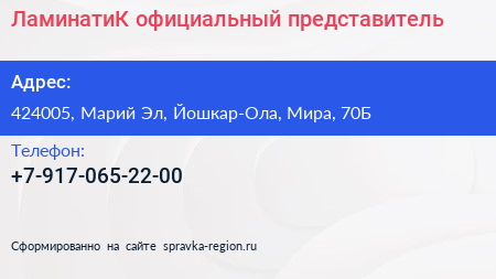 ЛаминатиК, официальный представитель по адресу 424005, Марий Эл, Йошкар-Ола, Мира, 70Б в дальнейшем Организация, размещена в следующих категориях: