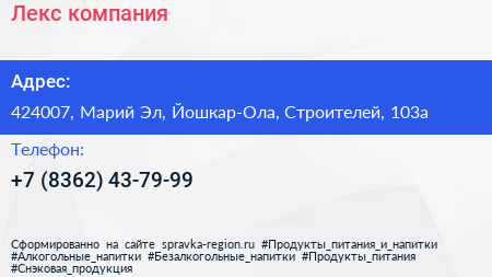 Лекс, компания по адресу 424007, Марий Эл, Йошкар-Ола, Строителей, 103а в дальнейшем Организация, размещена в следующих категориях: