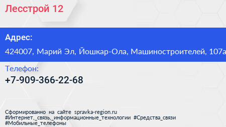 Лесстрой 12 по адресу 424007, Марий Эл, Йошкар-Ола, Машиностроителей, 107а в дальнейшем Организация, размещена в следующих категориях: