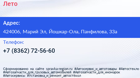 Лето по адресу 424006, Марий Эл, Йошкар-Ола, Панфилова, 33а в дальнейшем Организация, размещена в следующих категориях: