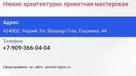 Нюанс, архитектурно-проектная мастерская по адресу 424002, Марий Эл, Йошкар-Ола, Пушкина, 44 в дальнейшем Организация, размещена в следующих категориях: