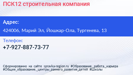 ПСК12, строительная компания по адресу 424006, Марий Эл, Йошкар-Ола, Тургенева, 13 в дальнейшем Организация, размещена в следующих категориях: