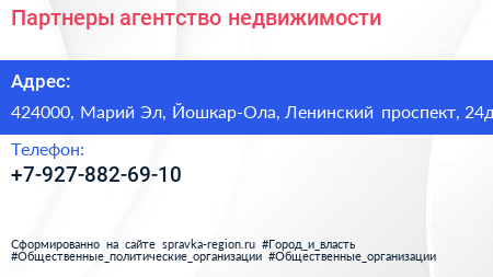 Партнеры, агентство недвижимости по адресу 424000, Марий Эл, Йошкар-Ола, Ленинский проспект, 24д в дальнейшем Организация, размещена в следующих категориях: