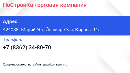ПоСтройКа, торговая компания по адресу 424038, Марий Эл, Йошкар-Ола, Кирова, 11в в дальнейшем Организация, размещена в следующих категориях: