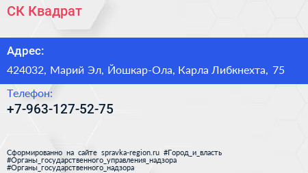 СК Квадрат по адресу 424032, Марий Эл, Йошкар-Ола, Карла Либкнехта, 75 в дальнейшем Организация, размещена в следующих категориях: