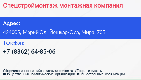 Спецстроймонтаж, монтажная компания по адресу 424005, Марий Эл, Йошкар-Ола, Мира, 70Б в дальнейшем Организация, размещена в следующих категориях: