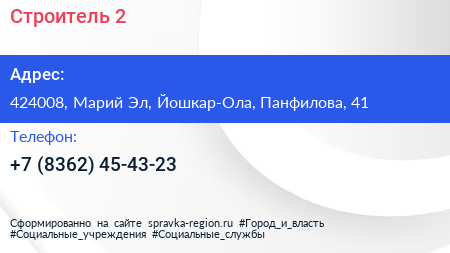 Строитель-2 по адресу 424008, Марий Эл, Йошкар-Ола, Панфилова, 41 в дальнейшем Организация, размещена в следующих категориях: