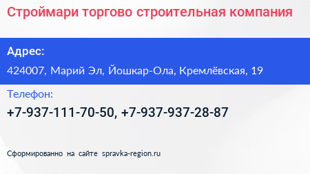 Строймари, торгово-строительная компания по адресу 424007, Марий Эл, Йошкар-Ола, Кремлёвская, 19 в дальнейшем Организация, размещена в следующих категориях: