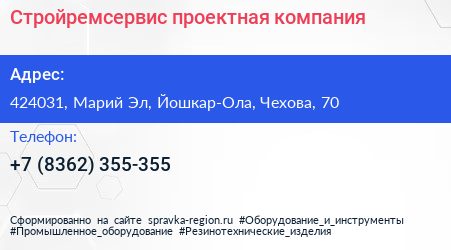 Стройремсервис, проектная компания по адресу 424031, Марий Эл, Йошкар-Ола, Чехова, 70 в дальнейшем Организация, размещена в следующих категориях: