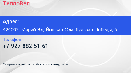 ТеплоВел по адресу 424002, Марий Эл, Йошкар-Ола, бульвар Победы, 5 в дальнейшем Организация, размещена в следующих категориях: