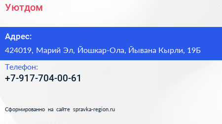 Уютдом по адресу 424019, Марий Эл, Йошкар-Ола, Йывана Кырли, 19Б в дальнейшем Организация, размещена в следующих категориях: