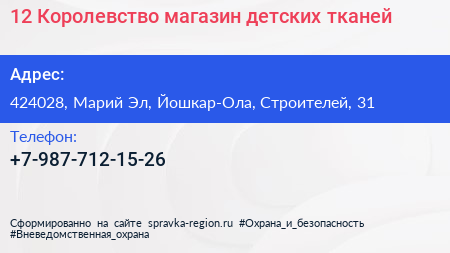 12 Королевство, магазин детских тканей по адресу 424028, Марий Эл, Йошкар-Ола, Строителей, 31 в дальнейшем Организация, размещена в следующих категориях: