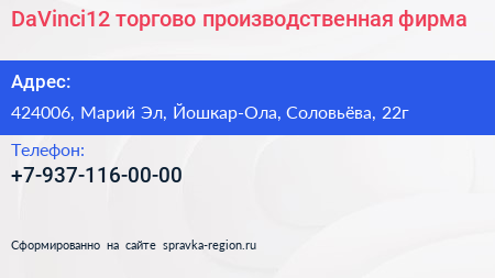 DaVinci12, торгово-производственная фирма по адресу 424006, Марий Эл, Йошкар-Ола, Соловьёва, 22г в дальнейшем Организация, размещена в следующих категориях: