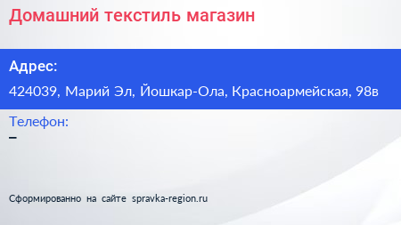 Домашний текстиль, магазин по адресу 424039, Марий Эл, Йошкар-Ола, Красноармейская, 98в в дальнейшем Организация, размещена в следующих категориях: