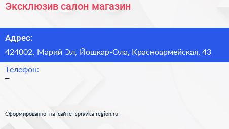 Эксклюзив, салон-магазин по адресу 424002, Марий Эл, Йошкар-Ола, Красноармейская, 43 в дальнейшем Организация, размещена в следующих категориях: