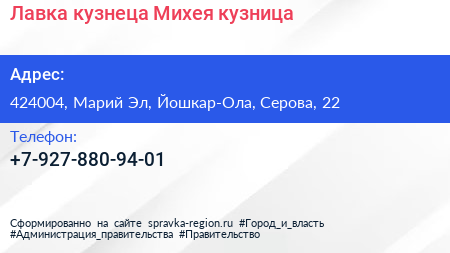 Лавка кузнеца Михея, кузница по адресу 424004, Марий Эл, Йошкар-Ола, Серова, 22 в дальнейшем Организация, размещена в следующих категориях: