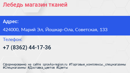 Лебедь, магазин тканей по адресу 424000, Марий Эл, Йошкар-Ола, Советская, 133 в дальнейшем Организация, размещена в следующих категориях: