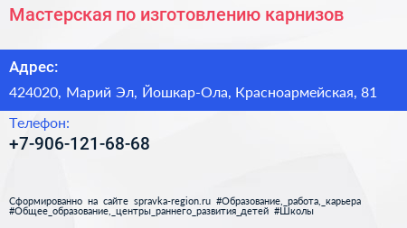 Мастерская по изготовлению карнизов по адресу 424020, Марий Эл, Йошкар-Ола, Красноармейская, 81 в дальнейшем Организация, размещена в следующих категориях: