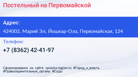 Постельный на Первомайской по адресу 424002, Марий Эл, Йошкар-Ола, Первомайская, 124 в дальнейшем Организация, размещена в следующих категориях: