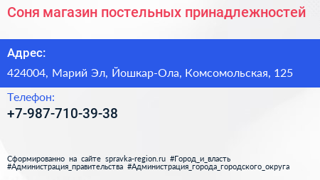 Соня, магазин постельных принадлежностей по адресу 424004, Марий Эл, Йошкар-Ола, Комсомольская, 125 в дальнейшем Организация, размещена в следующих категориях: