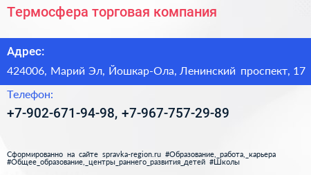 Термосфера, торговая компания по адресу 424006, Марий Эл, Йошкар-Ола, Ленинский проспект, 17 в дальнейшем Организация, размещена в следующих категориях: