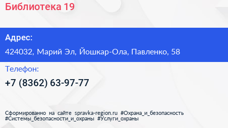 Библиотека №19 по адресу 424032, Марий Эл, Йошкар-Ола, Павленко, 58 в дальнейшем Организация, размещена в следующих категориях: