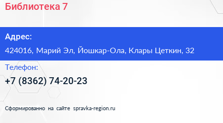 Библиотека №7 по адресу 424016, Марий Эл, Йошкар-Ола, Клары Цеткин, 32 в дальнейшем Организация, размещена в следующих категориях:
