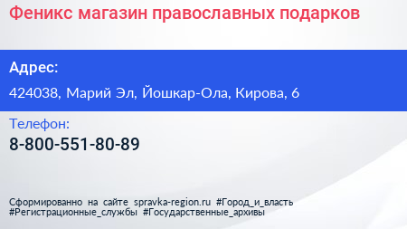 Феникс, магазин православных подарков по адресу 424038, Марий Эл, Йошкар-Ола, Кирова, 6 в дальнейшем Организация, размещена в следующих категориях: