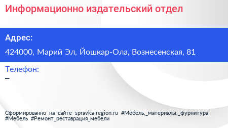 Информационно-издательский отдел по адресу 424000, Марий Эл, Йошкар-Ола, Вознесенская, 81 в дальнейшем Организация, размещена в следующих категориях: