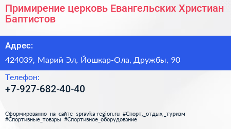 Примирение, церковь Евангельских Христиан-Баптистов по адресу 424039, Марий Эл, Йошкар-Ола, Дружбы, 90 в дальнейшем Организация, размещена в следующих категориях: