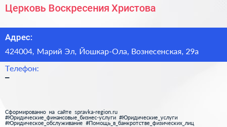 Церковь Воскресения Христова по адресу 424004, Марий Эл, Йошкар-Ола, Вознесенская, 29а в дальнейшем Организация, размещена в следующих категориях: