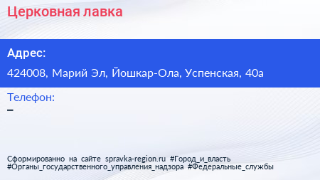 Церковная лавка по адресу 424008, Марий Эл, Йошкар-Ола, Успенская, 40а в дальнейшем Организация, размещена в следующих категориях: