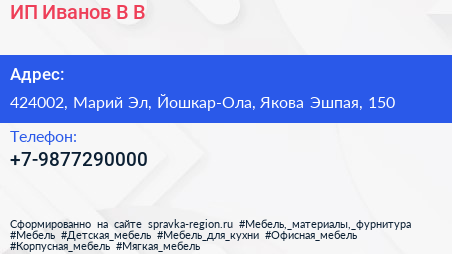 ИП Иванов В.В. по адресу 424002, Марий Эл, Йошкар-Ола, Якова Эшпая, 150 в дальнейшем Организация, размещена в следующих категориях: