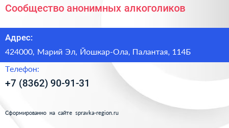 Сообщество анонимных алкоголиков по адресу 424000, Марий Эл, Йошкар-Ола, Палантая, 114Б в дальнейшем Организация, размещена в следующих категориях: