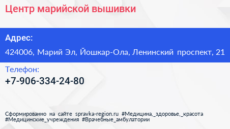 Центр марийской вышивки по адресу 424006, Марий Эл, Йошкар-Ола, Ленинский проспект, 21 в дальнейшем Организация, размещена в следующих категориях: